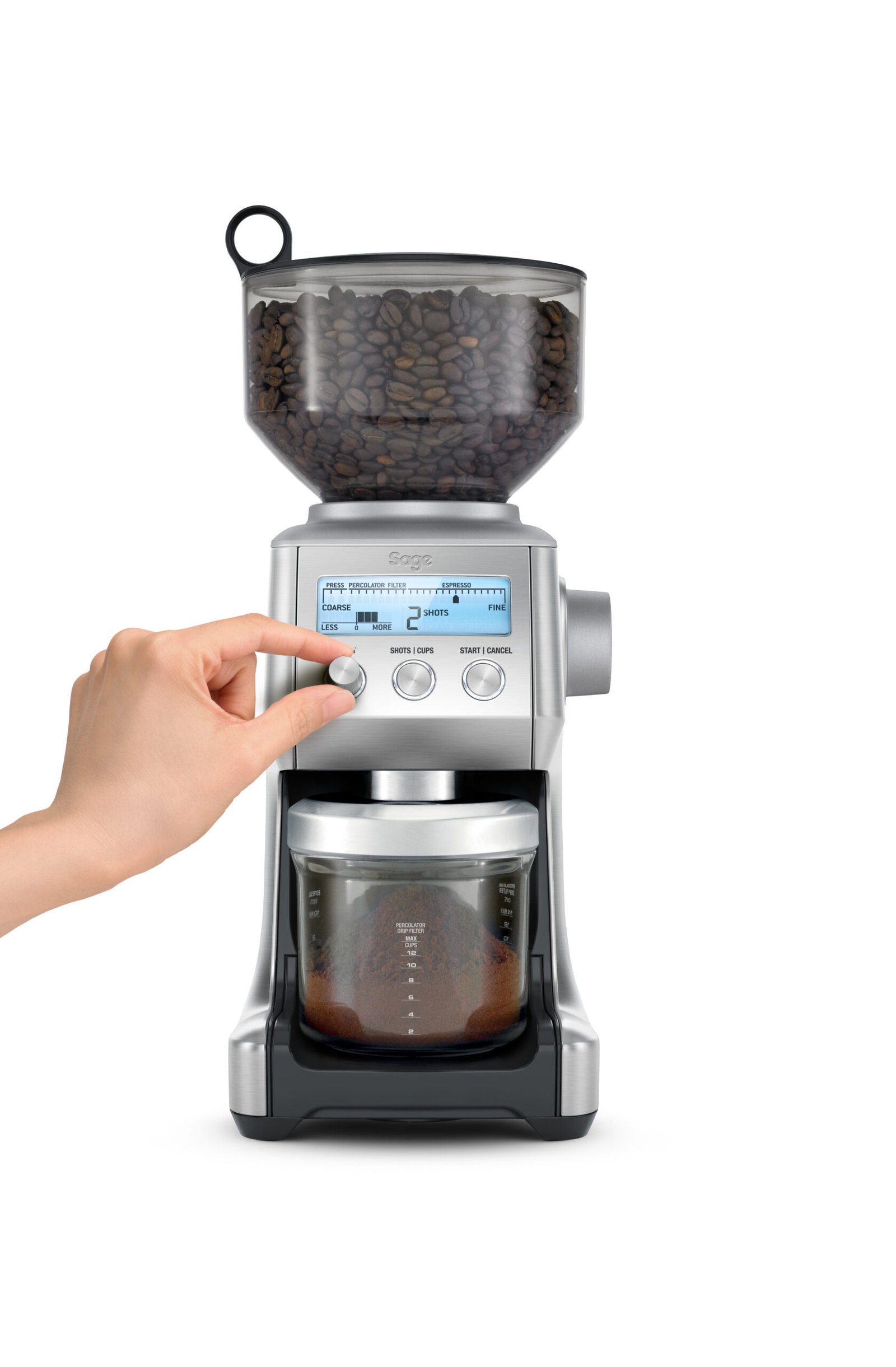 the Smart Grinder Pro Coffee Grinder in Brushed Stainless Steel LCD display