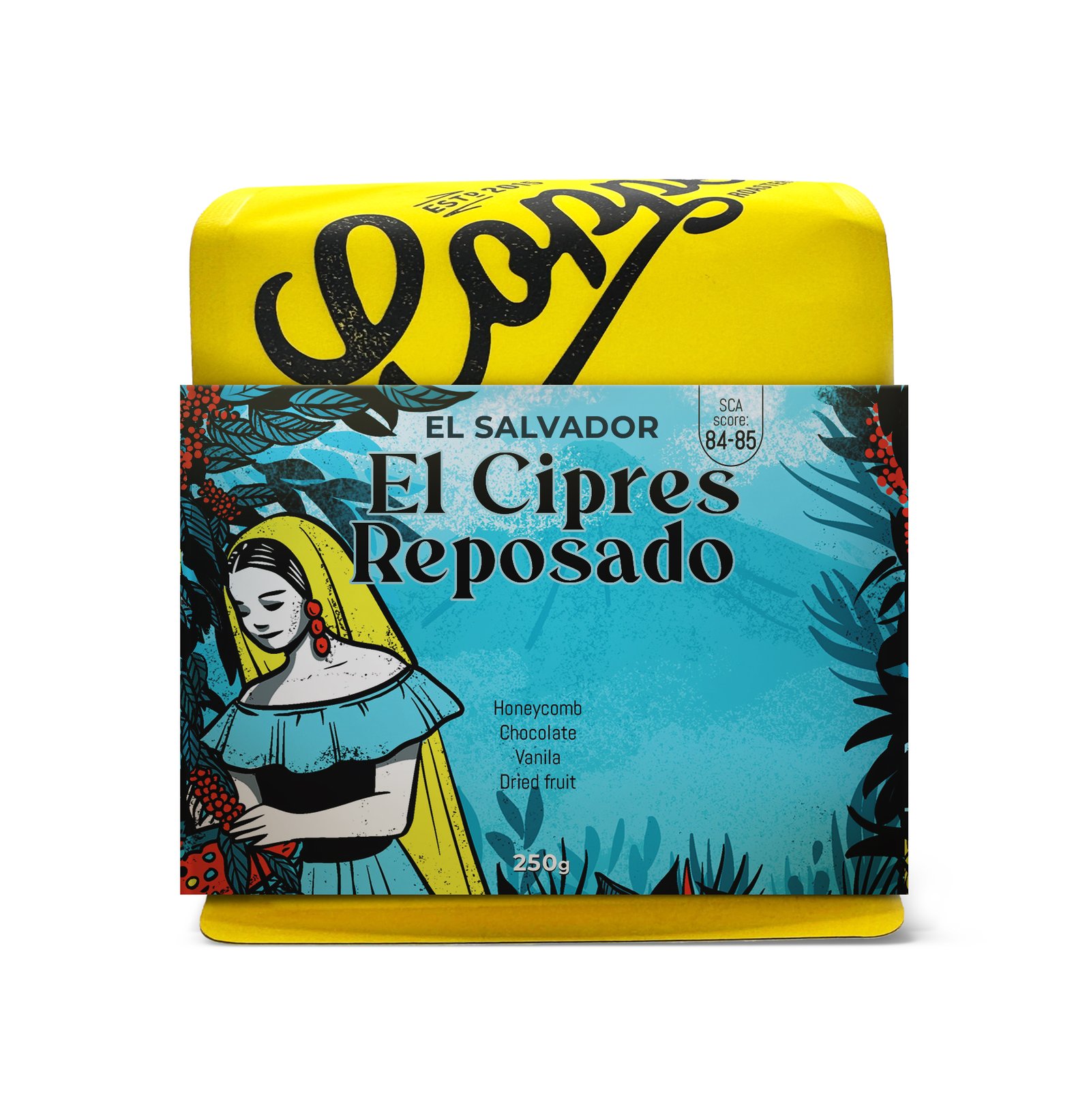 El Cipres Reposado is a rich and comforting specialty coffee from the highlands of El Salvador. Grown at 1300 MASL in the Balsamo-Quezaltepec region, this Red Bourbon varietal undergoes a unique natural reposado process, where the beans are gently rested to enhance complexity and sweetness.